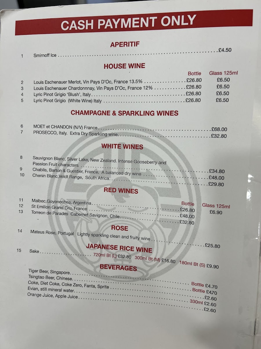Alongside the main dishes, the menu includes inventive sides like French Bean in XO Sauce and Aubergine with Minced Prawn Tofu, which add variety and balance. The beverage list features a small yet thoughtful range of wines and sake, catering to those who enjoy pairing traditional Chinese dishes with a glass.